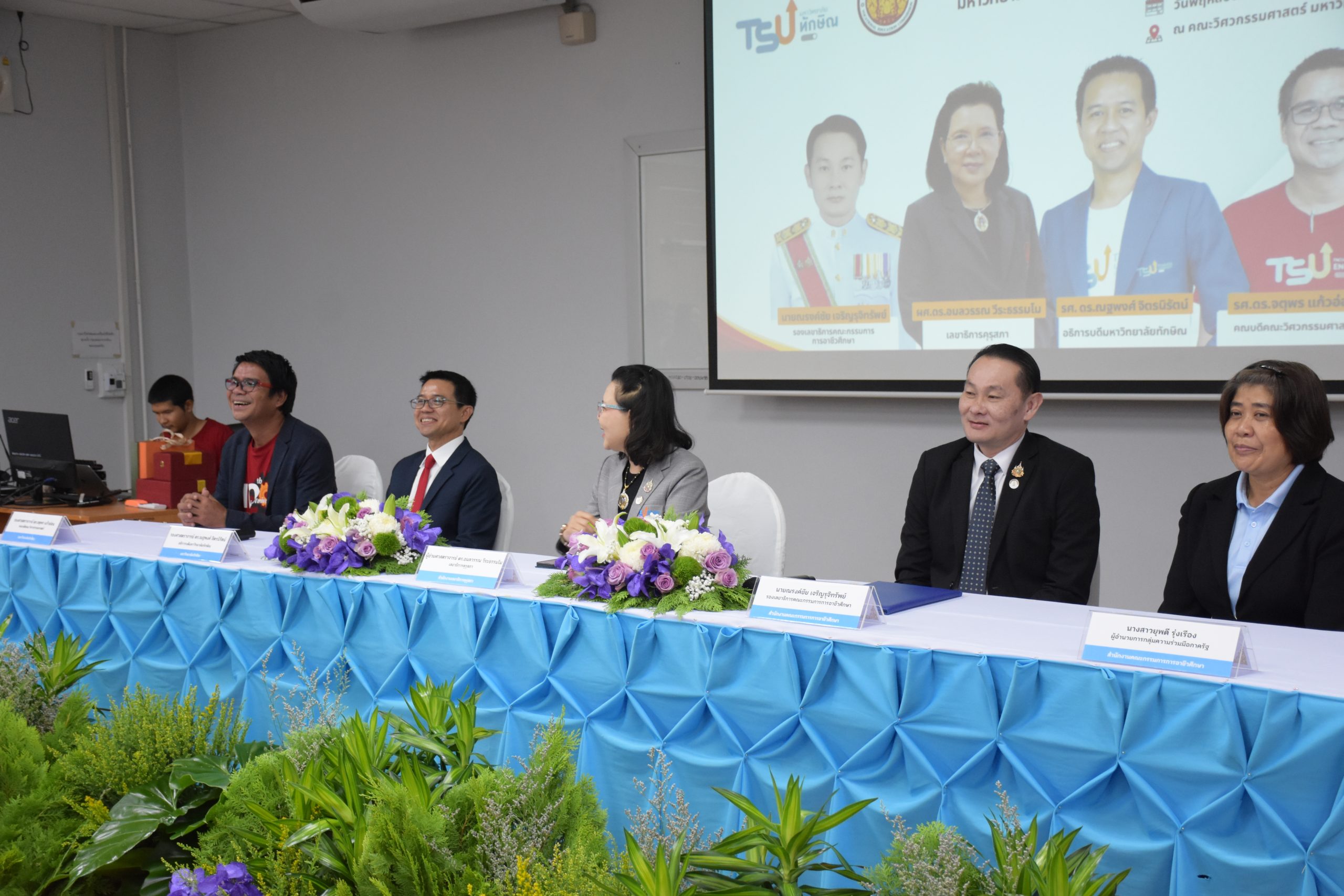 พิธีลงความร่วมมือด้านวิชาการและพัฒนากำลังคน ระหว่าง มหาวิทยาลัยทักษิณ กับ สำนักงานคณะกรรมการการอาชีวศึกษา วันที่ 7 สิงหาคม 2568 นายอดิศักดิ์ ชัชเวช ผู้อำนวยการสถาบันการอาชีวศึกษาภาคใต้ 2 มอบหมายให้นายธิติวัชร์ ไพศาลกิจสงวน ผู้อำนวยการสำนักพัฒนายุทธศาสตร์และความร่วมมืออาชีวศึกษา เข้าร่วมพิธีลงนามบันทึกข้อตกลงความร่วมมือด้านวิชาการและพัฒนากำลังคน ระหว่าง มหาวิทยาลัยทักษิณ กับ สำนักงานคณะกรรมการการอาชีวศึกษา ณ คณะวิศวกรรมศาสตร์ มหาวิทยาลัยทักษิณ วิทยาเขตพัทลุง